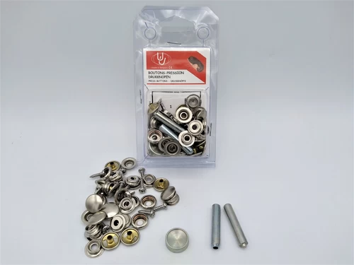 Voor verschillende toepassingen op bijvoorbeeld een boot, op de camping of voor een oldtimer cabrio worden drukknopen gebruikt. Een drukknoop is zeer stevig, weerbestendig en eenvoudig zelf te monteren. Wij hebben twee verschillende soorten drukknopen in het assortiment: drukknopen waarbij beide zijden in stof worden vastgezet en een soort drukknopen waarbij een zijde op een oppervlak wordt geschroefd en de andere zijde in stof komt te zitten om dit stof op een oppervlak vast te zetten. De drukknopen worden verkocht in een verpakking met daarbij de bijbehorende attributen om de drukknopen te kunnen monteren.